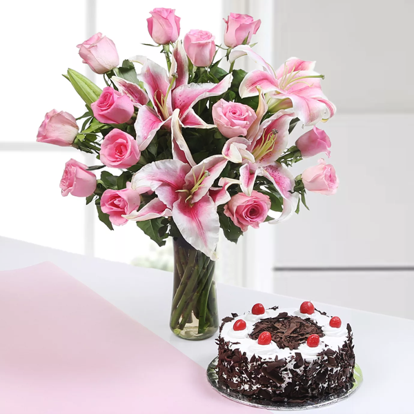 This set has a black forest cake, and a glass vase. The glass vase has an arrangement of 10 pink roses and 3 lilies. Pink roses represent love and appreciation, and lilies symbolize purity. The cake’s eggless version is also available. This set makes a perfect gourmet and floral gift. 10 Pink Roses With Beautiful Fillers 2 Lilies Black Forest Cake ( 2 Pound Cake) This item is hand-arranged and delivered by a team member of ProFlowers.pk. If the bloomy flask shown online is not available, a similar or same price flask/flowers will be used. Local Bakery Cake This product is available in Lahore Only. Substitution policy applies if any product is not available*